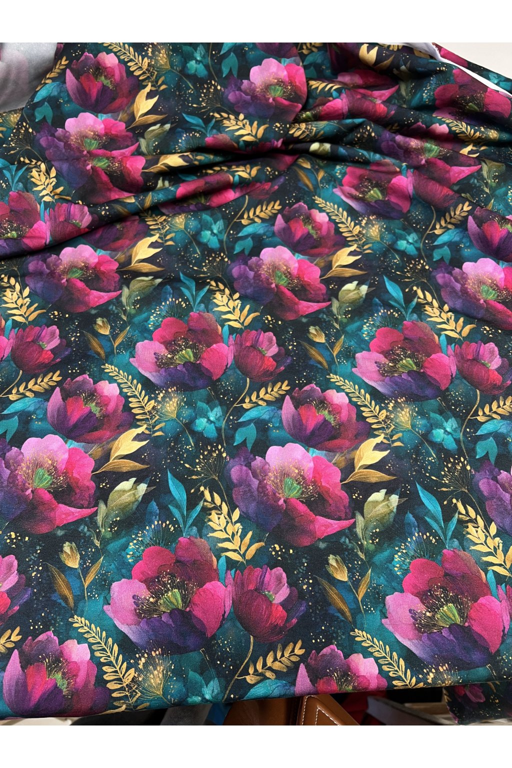 Magické květy rozkvétají na hlubokém tmavém podkladu jako světlo v noci. Teplé tóny květů – korálová, měděná, růžová i tyrkysová – se prolínají v malovaném, téměř snovém vzoru. Působí klidně, ženský, a přesto mají v sobě sílu, která je nepřehlédnutelná.