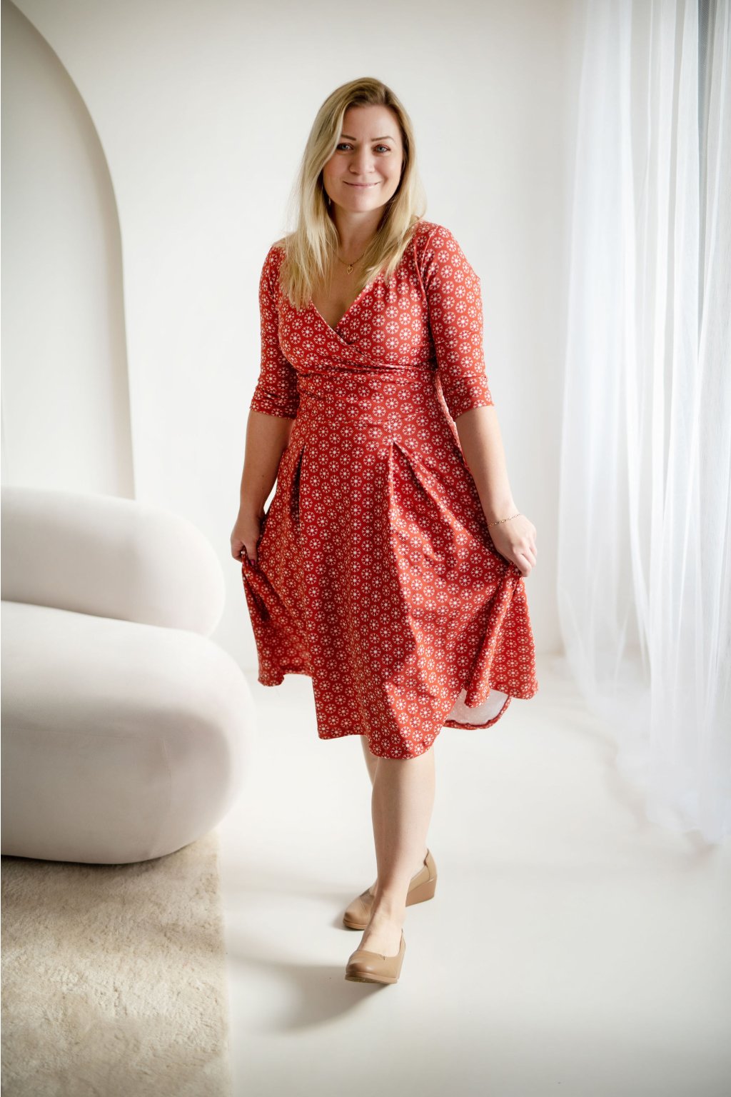 Zavinovací živůtek jemně objímá vaši siluetu a přidává špetku smyslnosti, která se promítne do vašeho úsměvu. Áčková sukně vám umožňuje pohyb s lehkostí a elegancí, ať už kráčíte městem nebo tančíte na večírku. Šaty Adriana vám dodají pocit sebevědomí a svobody, protože víte, že s nimi budete působit nádherně, ať vás čeká jakýkoliv den.