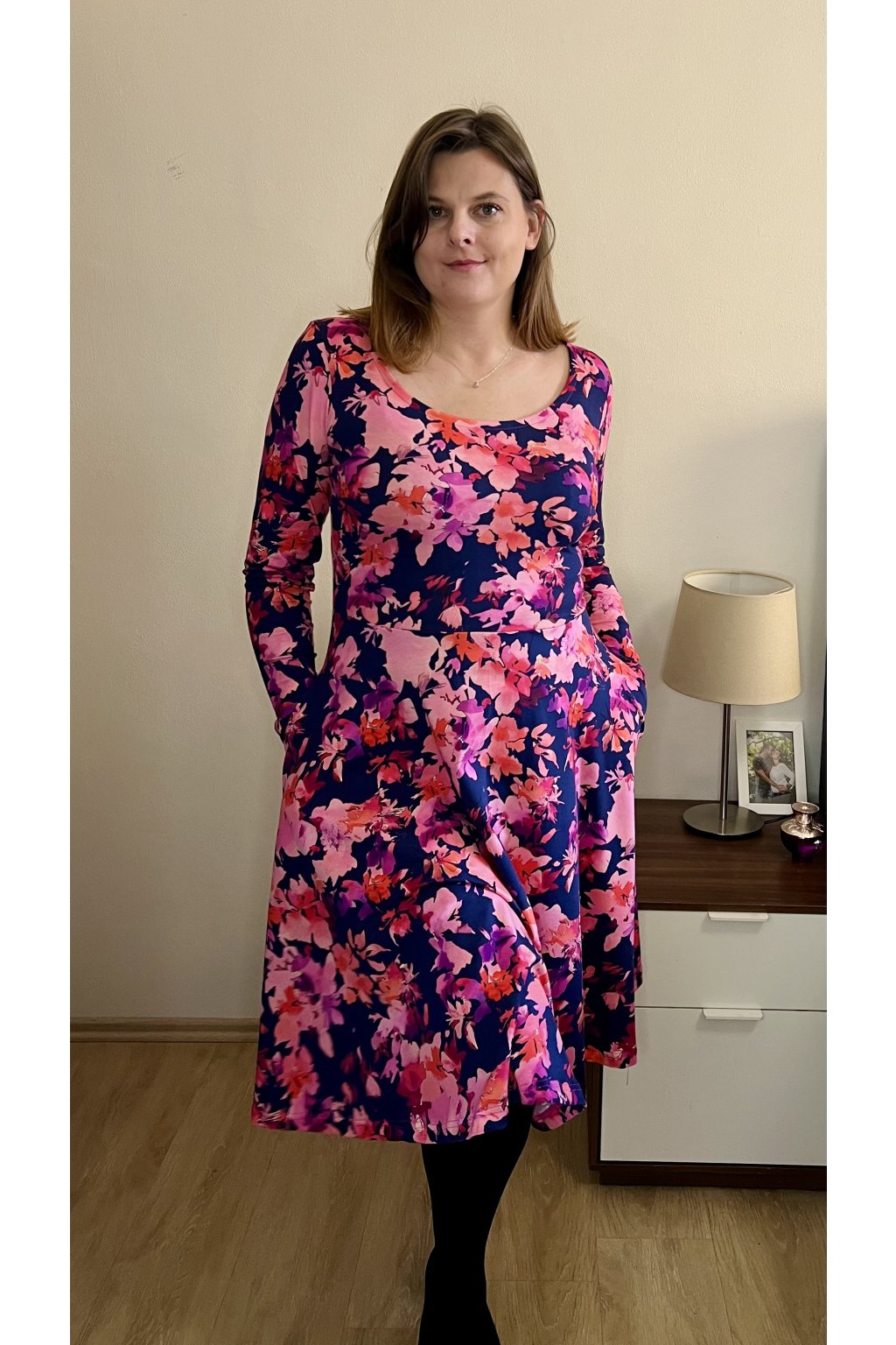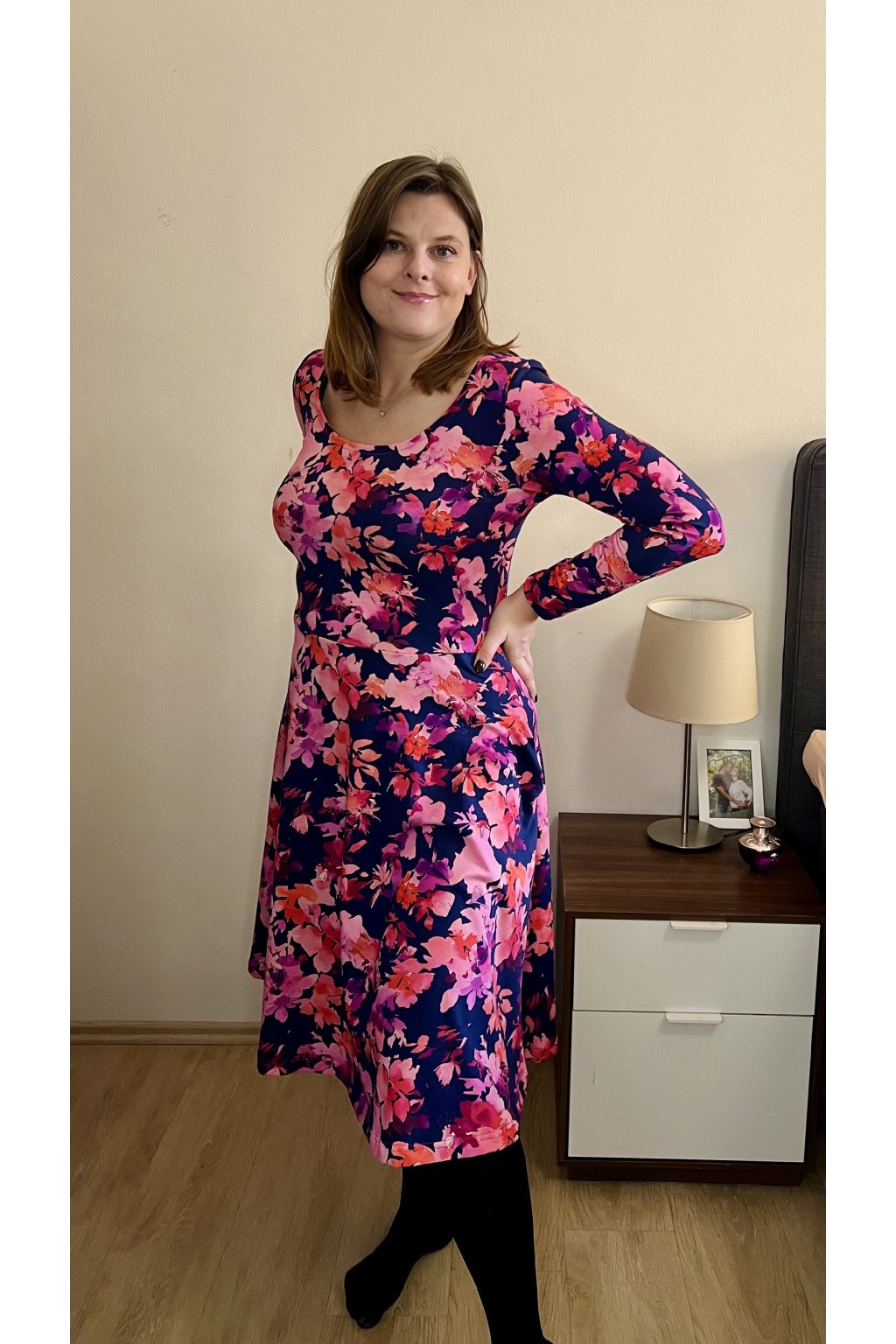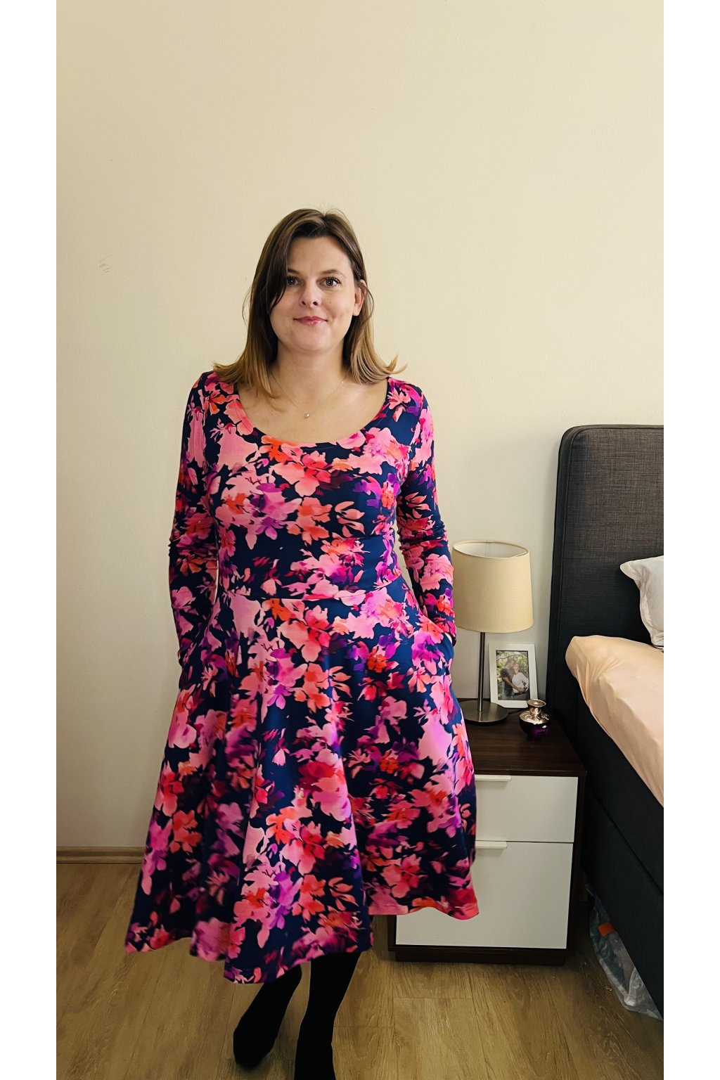 Kulatý výstřih nechává vyniknout tvé přirozenosti, sukně se s lehkostí rozvíjí kolem nohou a květinový vzor působí jako pohlazení pro oči i duši.